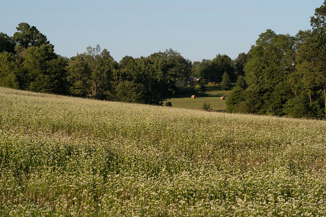 The buckwheat is blooming along Cuzzart Road. White froth riding on a green sea. You don’t see farmers raising buckwheat around here like they once did.